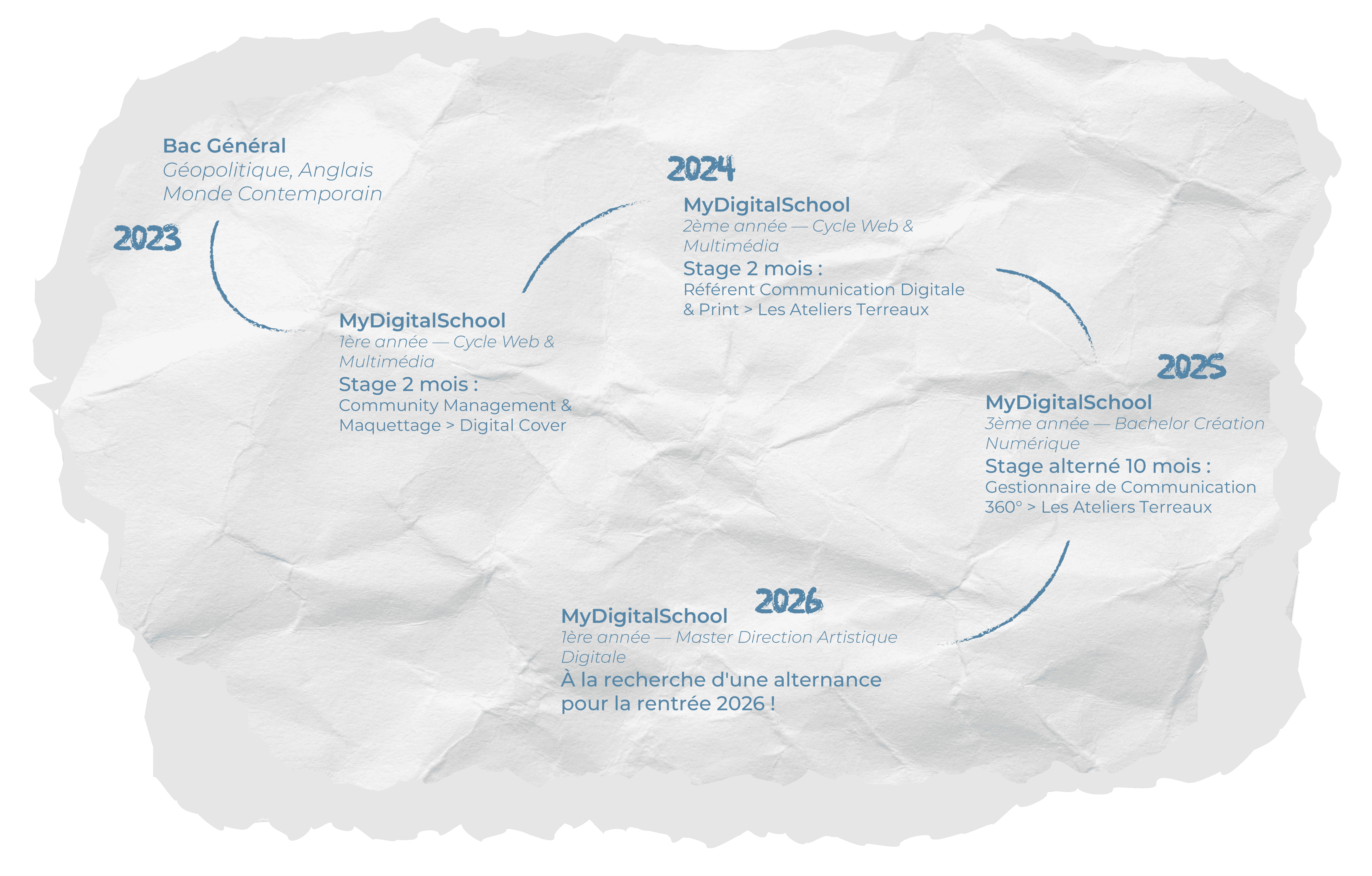 Au cours de mes 3 dernières années d'études, j'ai acquis de nombreuses compétences dans le domaine du digital, et plus particulièrement en création numérique : du motion design au branding, en passant par l'illustration et la stratégie d'image de marque — autant de disciplines qui me permettent de donner du sens et de la cohérence aux univers visuels que je construis.